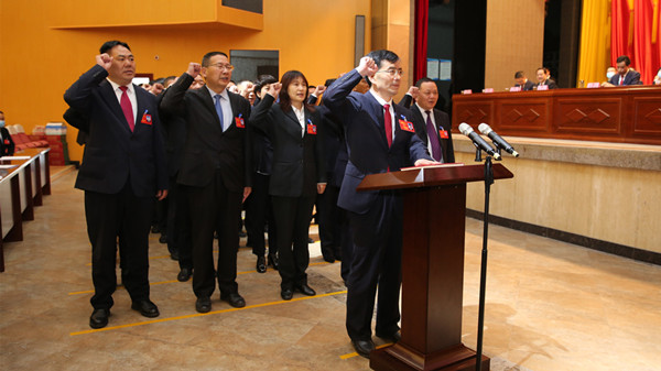 縣人大常委會(huì)主任、副主任、委員向憲法宣誓。