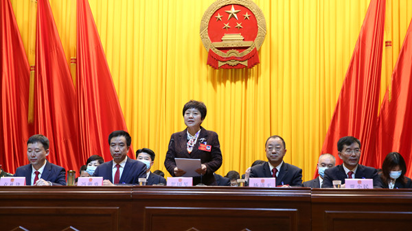 大會(huì)主席團(tuán)常務(wù)主席賀國(guó)琴主持第二次全體會(huì)議。