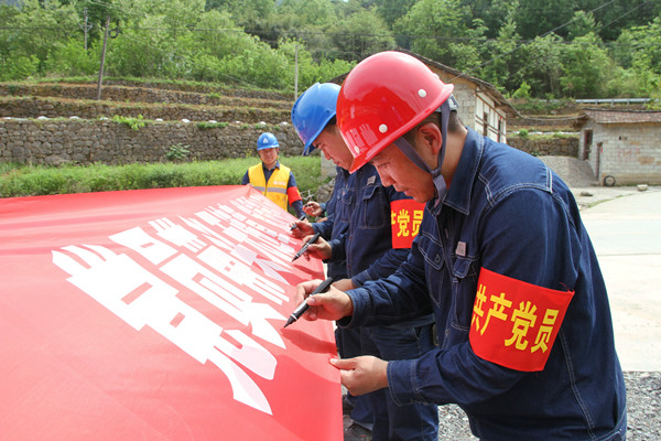 活動(dòng)中,安監(jiān)部負(fù)責(zé)人組織現(xiàn)場(chǎng)黨員及供電所員工學(xué)習(xí)了《習(xí)近平總書(shū)記近日關(guān)于安全生產(chǎn)工作重要指示精神》、國(guó)務(wù)院安委會(huì)《關(guān)于進(jìn)一步強(qiáng)化安全生產(chǎn)責(zé)任落實(shí)堅(jiān)決防范遏制重特大事故的若干措施》以及國(guó)網(wǎng)第三期安全快報(bào),在施工現(xiàn)場(chǎng),黨員代表面向黨旗,做出黨員身邊“無(wú)違章、無(wú)事故、無(wú)違紀(jì)”公開(kāi)承諾,并在“黨員帶頭無(wú)違章、黨員帶頭反違章”橫幅上簽字。