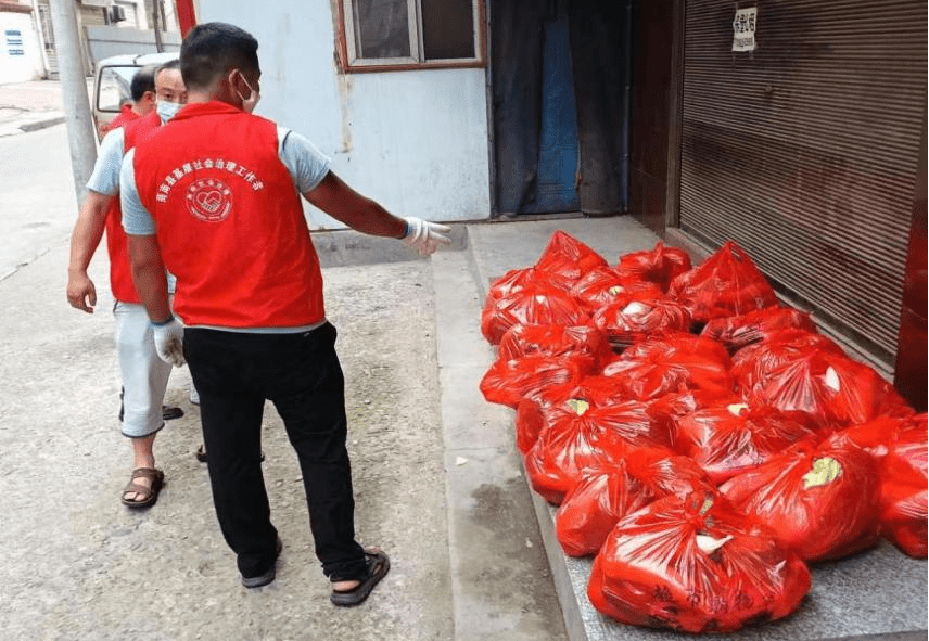 “物資到了!”,收到信息,物資配送組的11名黨員干部和志愿者立馬來了精神,或用手搬、或用肩扛,卸完一車貨物,做好統(tǒng)計、分好任務(wù),便立即開始物資配送。他們顧不上天氣悶熱,在封控區(qū)外把志愿者已經(jīng)分好的物資包以及居民自己購買的必需品嚴格進行了消殺,再送至封控區(qū)內(nèi)26戶66人村民家中,同時,將住戶生活垃圾進行收集整理,運至封控區(qū)外統(tǒng)一處理,幾個小時工作下來,全身已全部被汗水浸透。