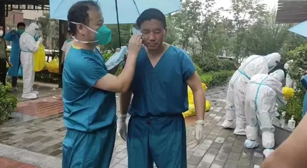 面對每天新增的數(shù)字,他們也會忐忑,也會恐懼,他們也是平凡人,有牽絆,有責任和不舍,但沒有人退縮。在第二組負責的22棟樓中,有9棟沒有電梯,每棟七層,4個單元,完成一棟樓就要徒步上下56層樓梯,有的樓層沒有路燈,他們就打開手機手電筒,就著手電筒微弱的亮光摸索著前行,在穿著防護服,帶著采集物資的情況下,爬第一二層還有點力氣,再往上就氣喘吁吁,汗流浹背了,但不論是40歲以上的“老將”,還是青春稚嫩的“新兵”,大家都爭著上前,接力完成徒步爬樓梯采核酸的任務。所有人脫下防護服的時候,汗水早已浸透全身,就像從水里剛爬出來一樣,雙手被汗水泡的發(fā)白,臉頰被勒得疼痛麻木,有人身體大面積過敏起疹子,有人中暑倒地了……但他們說,病毒都不怕,這些困難又算什么?沒有人叫苦喊累,沒有人畏懼退縮,完成任務后,他們又拖著疲憊的身軀舟車勞頓返回洛南,第二天凌晨4時又再次乘車奔赴商州,大家齊心協(xié)力、團結(jié)協(xié)作,圓滿地完成每日5400余人的采集任務。