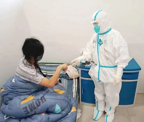 進(jìn)艙后,楊發(fā)儉發(fā)現(xiàn)住進(jìn)來(lái)的病人最大的特點(diǎn)就是焦慮?!澳懿荒苤魏茫沂裁磿r(shí)候能出去?”“我家里小孩沒人管怎么辦?”......面對(duì)這些,她能做的就是盡力去安撫,讓他們恐懼心情得到緩解,讓他們覺得這里也是另外一個(gè)大家庭。辦理確診新病人入院、住院期間患者生活護(hù)理、特殊病人生命體征的監(jiān)測(cè)、觀察、護(hù)理治療、出院病人終末消毒......一刻也不曾停歇,不顧疲倦與勞累,她心中只想著怎樣能讓患者減輕痛苦。