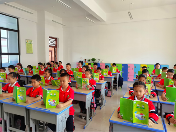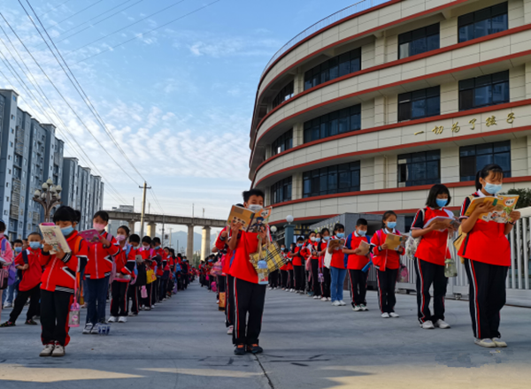 同學(xué)們早早地來到學(xué)校門口,自覺排隊,并拿出自己的書本,大聲朗讀。