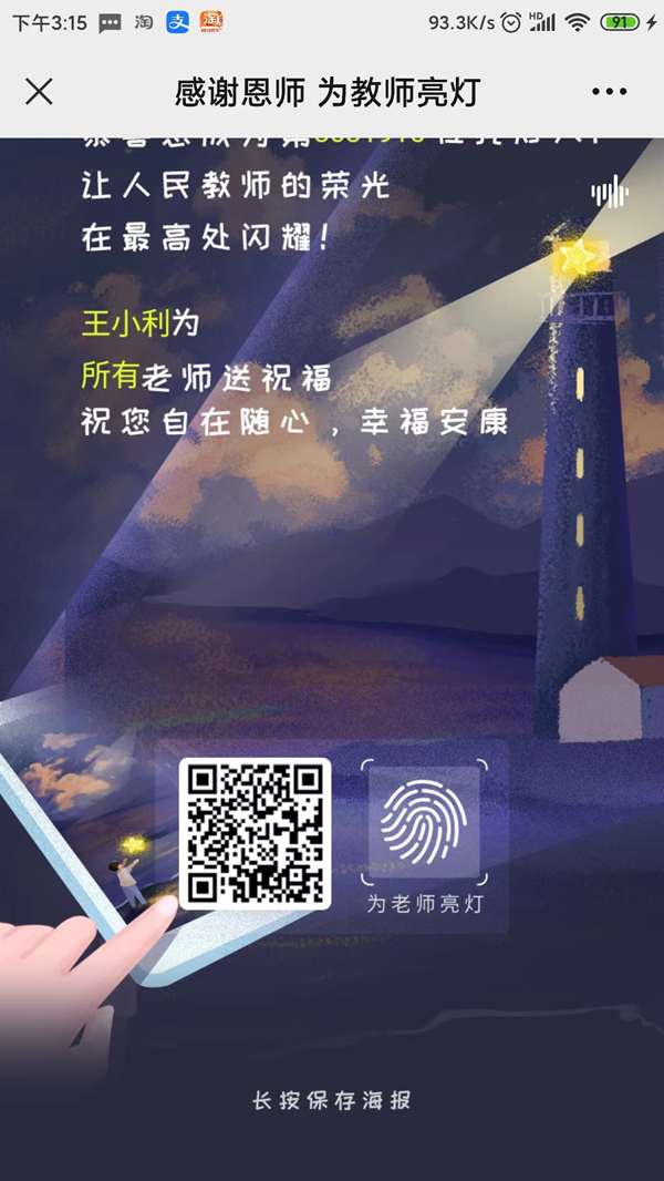 亮燈活動,是省教育廳在全國第38個教師節(jié)期間開展的公益活動,體現(xiàn)了省市區(qū)領(lǐng)導(dǎo)對教育事業(yè)的重視與關(guān)懷,對教師的肯定與激勵,是節(jié)日崇高的敬禮。“為教師亮燈”是一種態(tài)度,讓老師們充滿榮譽感和幸福感;“為教師亮燈”也是一種行動,讓尊師重教的優(yōu)良傳統(tǒng)落在實處;“為教師亮燈”更是一種鞭策,讓教師不忘初心、擔(dān)當(dāng)育人使命。”(王婷)