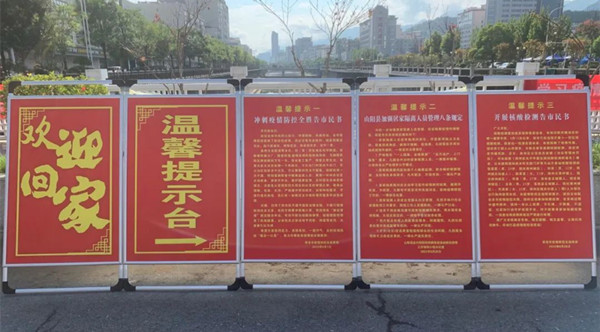 簡(jiǎn)約、有序、溫馨地迎接。指揮部安排制作“歡迎回家”標(biāo)識(shí)與“溫馨提示臺(tái)”,擺放在轉(zhuǎn)運(yùn)大巴指定??奎c(diǎn)附近,第一時(shí)間傳遞黨和政府的關(guān)心關(guān)愛(ài),告知群眾返家注意事項(xiàng)。5張紅底黃字示意牌,形式簡(jiǎn)約卻愛(ài)意滿滿。