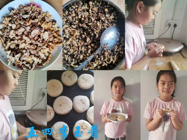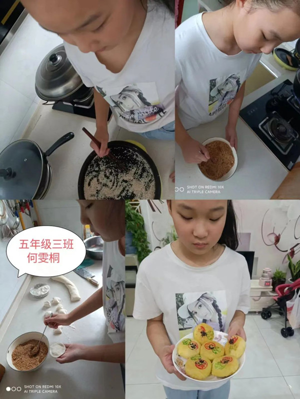 活動一開始,各中隊隊員激情高漲,積極準備好做月餅的材料,在家人的協(xié)助和指導下,揉面團、包餡、放模具內(nèi)按壓成型、烘烤,個個猶如小小烘焙師,做得有模有樣。不一會兒,一個個漂亮的月餅在隊員們的手中誕生了。瞧,小小巧手們做出來的團圓餅不僅形狀各異,有圓的、方的、心形的、橢圓形的,還壓上了各種有趣的花紋,里面的餡更是包羅萬象,有蛋黃餡、豆沙餡、堅果餡等,無不讓人垂涎三尺。