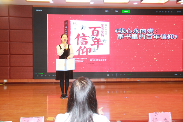 一襲紅色長裙、溫文爾雅的講書人張秋霞從革命烈士賀錦齋的一封家書展示開始,通過回望過去的時代,看到他們的情懷、追求和一顆為國捐軀的赤誠之心,激勵著我們誓用信仰之光照亮自己的教師生涯,為中國夢貢獻(xiàn)力量!