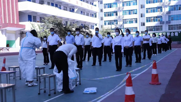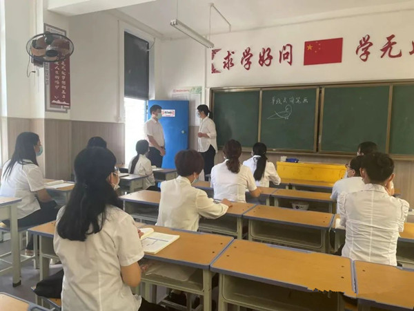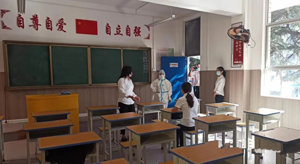 班主任李淑榮進(jìn)班宣布“8月15日下午1點(diǎn)到5點(diǎn)在萬某廣場出現(xiàn)陽性病例,現(xiàn)在排查此時(shí)間段在萬某廣場的密接人員”;學(xué)生們開始回憶并一一作答。其中一名“學(xué)生”趙芬舉手說自己此時(shí)間段確實(shí)在萬某廣場,班主任第一時(shí)間先引導(dǎo)學(xué)生們疏散開來,與該女生拉開距離原地待命,接著迅速撥通電話報(bào)告和請(qǐng)示疫情防控組領(lǐng)導(dǎo)舒會(huì)云副校長,隨即由其中一名工作人員將密接女生帶往隔離室,啟動(dòng)應(yīng)急處置流程;