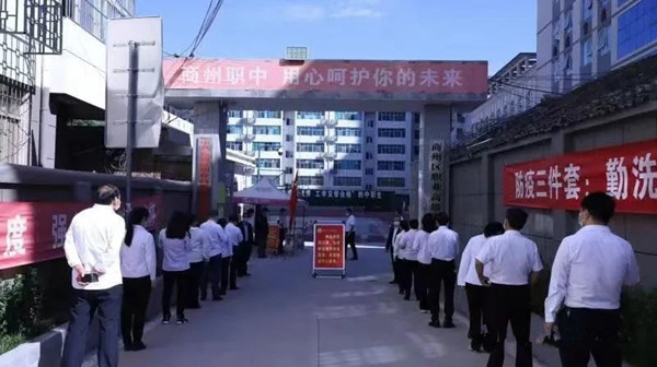 學(xué)校門口,由老師扮演學(xué)生從南、北兩路有序入校,要求佩戴口罩,每人間隔1米,通過測(cè)溫、消毒等環(huán)節(jié)進(jìn)入校園,當(dāng)值班老師發(fā)現(xiàn)一“學(xué)生”程倩怡通過測(cè)溫通道時(shí)體溫異常,一名老師立即將學(xué)生通過規(guī)定路線帶入臨時(shí)休息區(qū),校醫(yī)進(jìn)行二次測(cè)溫,并詢問該生近14天內(nèi)有無疫情重點(diǎn)地區(qū)旅居史、途經(jīng)史或與確診、疑似病例接觸史,并做好詳細(xì)記錄。