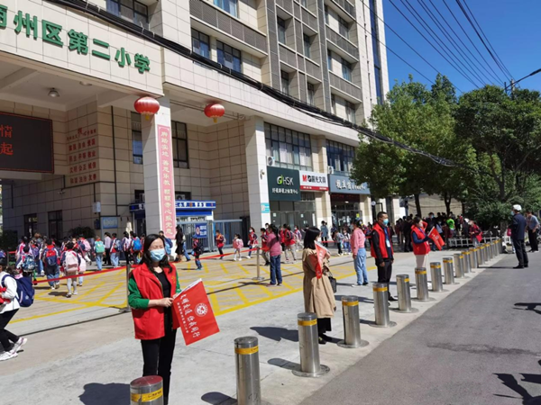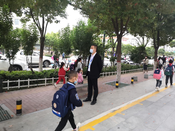 開展創(chuàng)文行動,共建文明城市。為了幫助一年級新生盡快適應(yīng)學(xué)校環(huán)境,養(yǎng)成排隊(duì)、有序出校門的文明習(xí)慣,各班積極開展路隊(duì)演練;班子成員在郭強(qiáng)校長的帶領(lǐng)下,自覺分布在學(xué)校大門外東西兩端值勤,組織學(xué)生有序進(jìn)出校園,勸說家長戴口罩、不聚集;黨員志愿者在校門口協(xié)助管理交通秩序,進(jìn)行文明交通勸導(dǎo),緩解了放學(xué)時間校門口的交通壓力。
