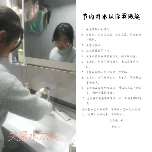 節(jié)水護(hù)水,你我同行。五、六年級學(xué)生通過家庭勞動實踐活動體驗一水多用,踐行節(jié)約用水??吹胶芏嗳瞬徽湎?,浪費水,亂扔垃圾污染水源,他們還想了一些小妙招,呼吁人們要珍惜水、節(jié)約水、保護(hù)水。豐富多彩的活動將商州區(qū)第一小學(xué)節(jié)水型學(xué)校建設(shè)工作推向高潮,孩子們在實踐中踐行,在體驗中感悟,在活動中了增強節(jié)水意識,體會到水對人類的重要性,懂得了要科學(xué)用水、文明用水、節(jié)約用水,保護(hù)水資源要從自己做起,從身邊點滴做起。讓“節(jié)水宣傳”真正走進(jìn)人們心中,走進(jìn)千家萬戶,使節(jié)約的火種得以傳承。(屈芳婷)