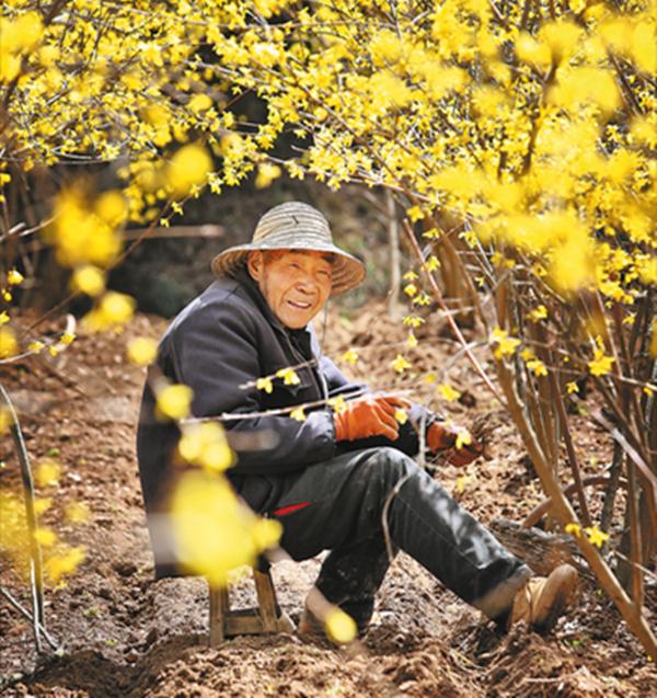 正在連翹園里種桔梗的呂水子老人說,去年他依靠連翹增收近萬元。