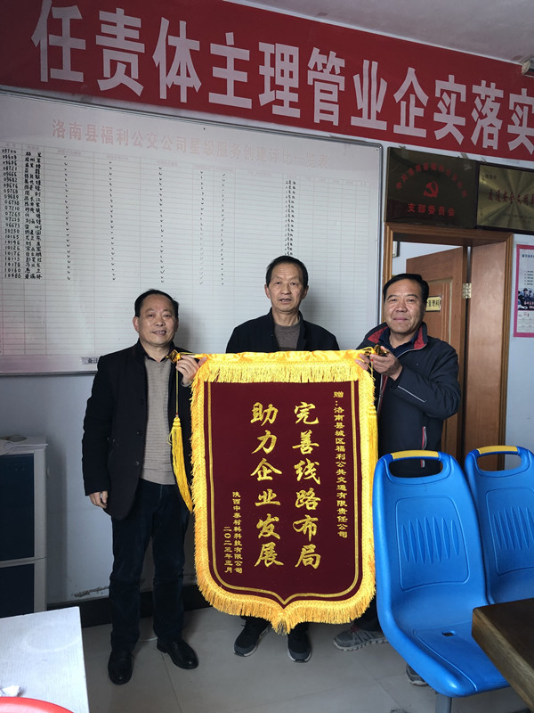 “感謝你們?yōu)槠髽I(yè)辦實(shí)事,解決職工上下班通行困難?!?月27日一大早,陜西中泰材料科技有限公司辦公室主任雷惠敏等人,將一面印有“合理布局線路 助力企業(yè)發(fā)展”的錦旗,送給洛南縣城區(qū)福利公交有限公司以表示謝意。