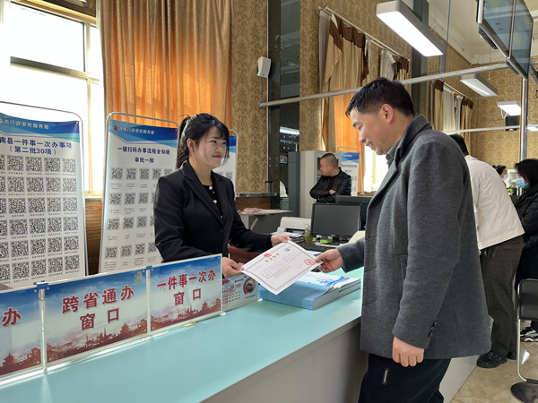說(shuō)話間,洛南縣洛南縣政務(wù)大廳工作人員李秉勛站起身,雙手向前來(lái)咨詢的群眾送上辦事指南。
