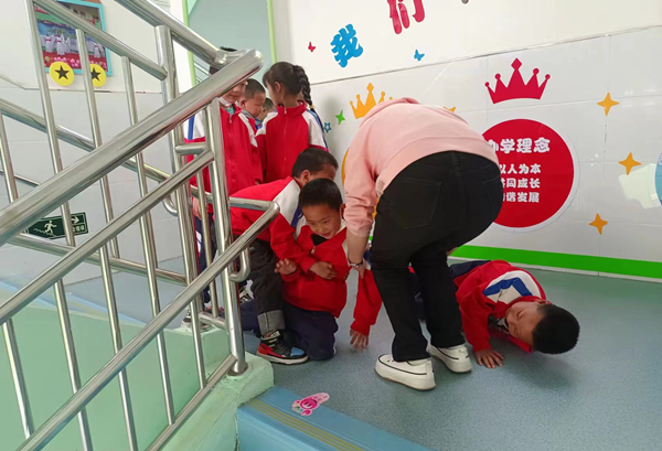 場(chǎng)景二:在樓道拐彎處,幼兒跌倒,當(dāng)發(fā)現(xiàn)自己前面有人突然摔倒了,馬上要停下腳步,同時(shí)大聲呼救,告知后面的人不要向前靠近,班主任老師立刻吹哨停止前行,提醒小朋友腳下站穩(wěn),抓緊扶手,防止摔倒,扶起摔倒的小朋友并通知醫(yī)療救護(hù)組。