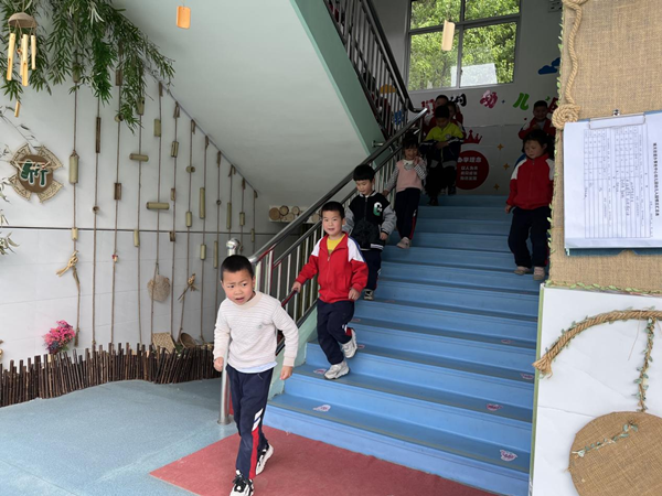 場(chǎng)景三:遇在樓道狹窄處時(shí),雙方首先要停止前行,按上下樓梯靠右行走的原則依次上下。知道不能擁擠,學(xué)會(huì)有序排隊(duì)逃生。