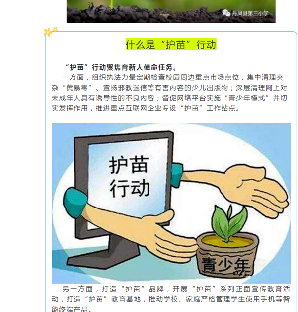 學(xué)校向家長發(fā)放“護苗”行動宣傳彩頁、“護苗”行動家庭教育建議書等內(nèi)容,及時清理學(xué)校和家庭中有害書籍和出版物,張貼“護苗”正能量標語、提示語,家校協(xié)作營造健康向上的“護苗”文化環(huán)境。良好的文化環(huán)境起到潛移默化的教育作用。