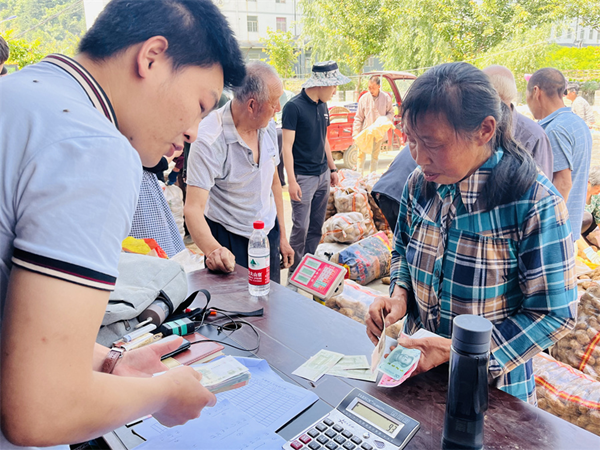 6月8日,山陽縣高壩店鎮(zhèn)魚塘村一農(nóng)戶場院里,人頭攢動(dòng),村民正忙著將剛采挖的土豆拉到這里,外地客商當(dāng)場過秤付錢收購。
