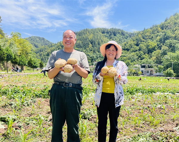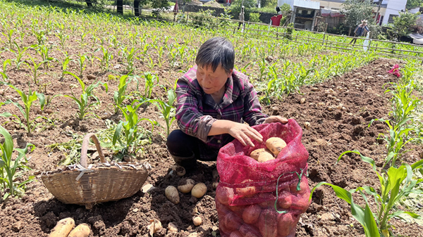 隨后,記者來到魚塘村村民程榮珍的地里,此時(shí)已是下午1點(diǎn),氣溫高達(dá)31℃,程榮珍卻忙著分揀、裝袋、拉貨,汗珠滑落臉龐,飯也顧不上吃,豐收的喜悅讓他充滿了干勁:“我今年種了4畝土豆,能賣1萬多元。前幾年種的土豆吃不完,也銷不出去,最后只能爛在屋里,今天村上有人來收,價(jià)格還不低,我得抓緊時(shí)間把土豆挖完?!?/p>