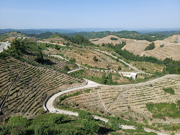 初夏時(shí)節(jié),站在商南縣茶旅康養(yǎng)融合示范園的山頂眺望,一排排弧形茶苗,猶如綠色腰帶一樣,從山腳依次纏到山頂。一條條黑色的滴水管道,緊貼茶苗根部。遠(yuǎn)望森林高山松柏,俯視茶苗郁郁蔥蔥,一幅壯美的畫(huà)卷渾然天成。
