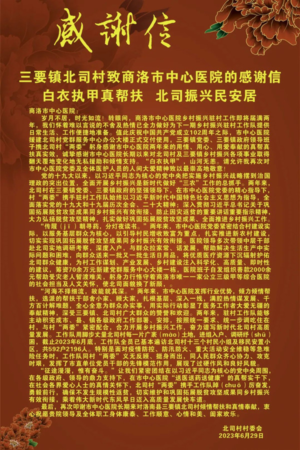 活動(dòng)儀式上,北司村黨支部書記、主任丁鎖子宣讀《感謝信》,深情回顧了兩年來我院在鞏固拓展脫貧攻堅(jiān)成果同鄉(xiāng)村振興有效銜接上用情、用心、真幫真扶取得的實(shí)效,對(duì)北司村鄉(xiāng)村振興各項(xiàng)事業(yè)取得翻天覆地變化及醫(yī)院的無私援助和傾情支持表示真摯感謝。姜偉峰代表三要鎮(zhèn)感謝市中心醫(yī)院長(zhǎng)期以來對(duì)北司村鄉(xiāng)村振興工作的重視和支持,援建北司村黨群服務(wù)中心辦公樓的正式投用是全鎮(zhèn)基層組織建設(shè)的一件大事、喜事,標(biāo)志著北司村的發(fā)展在新時(shí)代有了一個(gè)新的開端、新的形象、新的起點(diǎn)。村“兩委”干部向醫(yī)院敬獻(xiàn)鮮花、錦旗表示感謝。