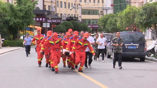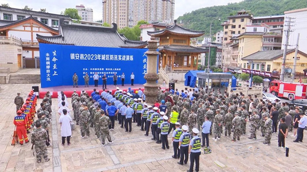本次城區(qū)演練模擬背景是:鎮(zhèn)安縣連續(xù)三日普降暴雨,接氣象部門升級(jí)發(fā)布的暴雨紅色預(yù)警信號(hào),鎮(zhèn)安縣城區(qū)降雨量累計(jì)達(dá)100毫米,預(yù)計(jì)未來1小時(shí)城區(qū)降雨量將達(dá)200毫米以上。由此引發(fā)山洪、中小河流洪水、滑坡泥石流等地質(zhì)災(zāi)害,城市內(nèi)澇,縣河、乾佑河水位暴漲,縣城低洼地帶房屋嚴(yán)重進(jìn)水,道路大面積積水,電力、通信、交通中斷,人民群眾生命財(cái)產(chǎn)安全受到嚴(yán)重威脅,縣防指發(fā)布防汛紅色預(yù)警?,F(xiàn)場(chǎng)指揮部根據(jù)防洪搶險(xiǎn)救災(zāi)要求,演練圍繞城市內(nèi)澇、人員撤離、車輛轉(zhuǎn)移、傷員救治、災(zāi)民安置等場(chǎng)景,涵蓋了防御部署、監(jiān)測(cè)預(yù)警、會(huì)商研判、隊(duì)伍集結(jié)、物資調(diào)度、人員撤離、搶險(xiǎn)救援等科目進(jìn)行。