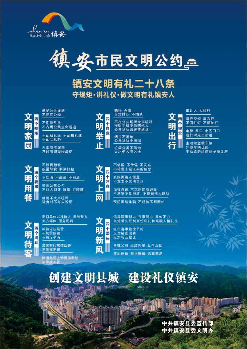 為有效消除發(fā)生在群眾身邊、群眾反映強(qiáng)烈的不文明行為的突出問(wèn)題,倡導(dǎo)廣大居民健康文明社會(huì)新風(fēng)尚,助推省級(jí)文明縣城創(chuàng)建工作,鎮(zhèn)安縣委宣傳部、縣委文明辦在學(xué)習(xí)經(jīng)驗(yàn)、開(kāi)展調(diào)研和廣泛征求各單位、各鎮(zhèn)街社區(qū)意見(jiàn)的基礎(chǔ)上,形成了《鎮(zhèn)安文明有禮二十八條暨鎮(zhèn)安市民文明公約》。