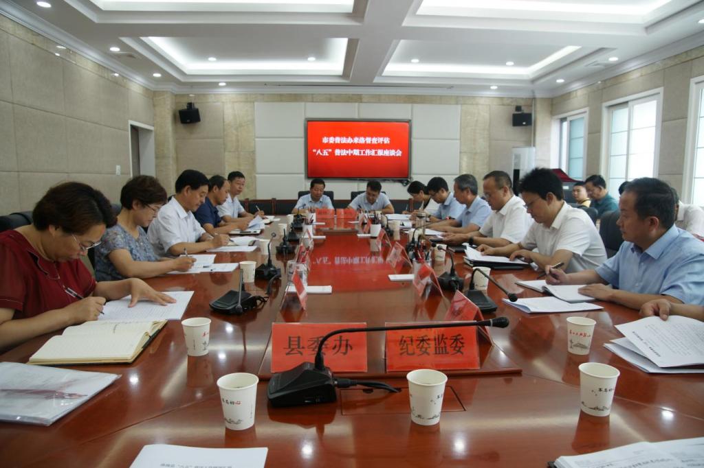 隨后,在縣委二樓會(huì)議室召開(kāi)了“八五”普法中期督查評(píng)估匯報(bào)座談會(huì)。會(huì)前,督查評(píng)估組觀看了《普法宣傳浸潤(rùn)心田 法治力量助推發(fā)展》專題片??h委常委、政法委書(shū)記、縣委普法工作領(lǐng)導(dǎo)小組組長(zhǎng)李福軍主持會(huì)議,縣政府副縣長(zhǎng)、公安局局長(zhǎng)秦立爭(zhēng)匯報(bào)了全縣“八五”普法工作情況。市人大常委會(huì)副主任、市委普法工作領(lǐng)導(dǎo)小組副組長(zhǎng)李旭光用“領(lǐng)導(dǎo)重視、部署及時(shí)、重點(diǎn)突出、成效明顯”十六字對(duì)我縣“八五”普法工作給予充分肯定,同時(shí)也指出了存在的問(wèn)題和差距,并從“突出重點(diǎn),全面落實(shí)任務(wù);查漏補(bǔ)缺,積極補(bǔ)齊短板;創(chuàng)新形式,營(yíng)造良好氛圍;夯實(shí)責(zé)任,形成工作合力”提出了整改建議,并強(qiáng)調(diào)要進(jìn)一步提高政治站位、正視問(wèn)題不足、強(qiáng)化責(zé)任擔(dān)當(dāng)、積極迎頭趕上。要對(duì)標(biāo)對(duì)表,突出重點(diǎn),聚焦難點(diǎn),全面夯實(shí)責(zé)任措施,逐問(wèn)題抓好整改,全面提升普法工作實(shí)效,全力以赴做好“八五”普法中期國(guó)家抽查、省上督導(dǎo)評(píng)估迎檢準(zhǔn)備工作。