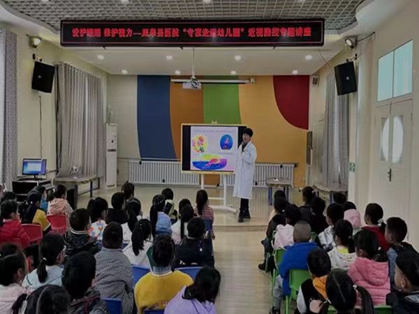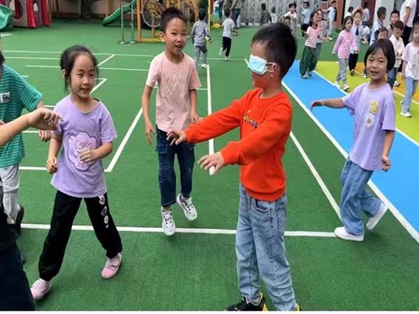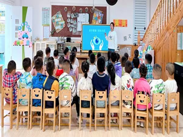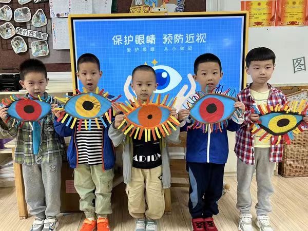 二是將近視防控知識(shí)融入幼兒日常生活?!鞍パ剑蠋?,我找不到我的熱水瓶了,老師我看不到路了,老師我看不見好害怕……”。何老師正帶孩子們?cè)谧鲅b盲人游戲,孩子們?cè)谟螒蛑姓媲畜w會(huì)到看不見多可怕。除此之外,各班還針對(duì)幼兒年齡特點(diǎn),開展豐富多彩的“愛眼、護(hù)眼”活動(dòng),通過兒歌、故事、情景表演和觀看生動(dòng)有趣的愛眼護(hù)眼視頻等多種形式讓孩子了解關(guān)于保護(hù)眼睛的知識(shí),并邀請(qǐng)專家進(jìn)校園開展愛眼護(hù)眼專題講座。還開展了系列教育教育活動(dòng),如:國(guó)旗下講話、盲人探物、蒙眼捉迷藏等小游戲,讓孩子真切體會(huì)到保護(hù)眼睛的重要性。