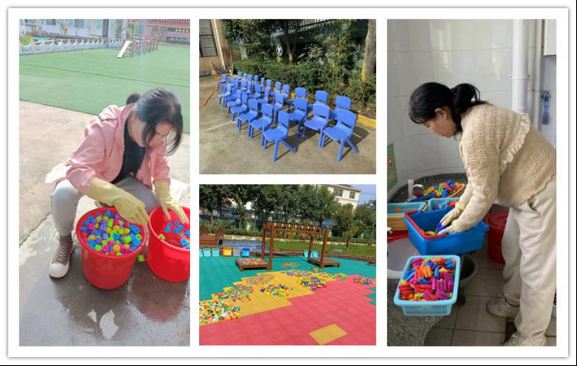 三是強化消毒通風工作。各教師根據(jù)《陜西省保育員工作指南》相關要求,活動室、寢室每天定時開窗通風,保持室內空氣流通,在衛(wèi)生消毒方面,嚴格按規(guī)定、程序執(zhí)行消毒流程,通過物品清洗、消毒液擦拭、陽光曝曬、紫外線照射等多種方式對幼兒圖書、餐具、玩具、臥具以及活動室、寢室、公共區(qū)域室等進行相應的清潔消毒、殺菌工作。