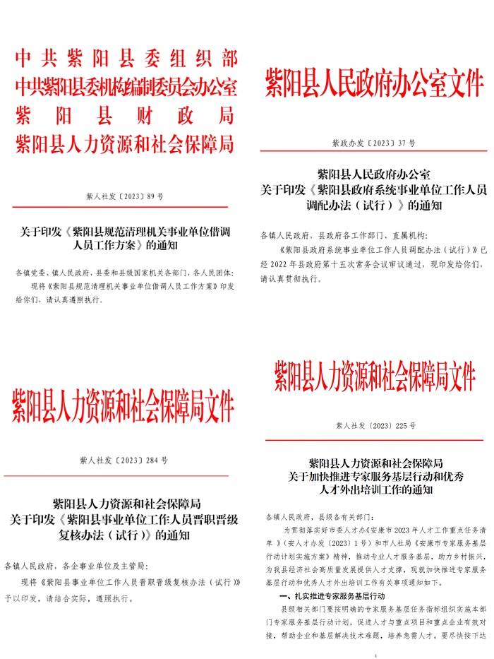 牢牢把握“民生為本、人才優(yōu)先”工作主線(xiàn),不斷深化人事制度改革,進(jìn)一步理順人事關(guān)系,激發(fā)干部干事創(chuàng)業(yè)熱情。加大人才招引力度,優(yōu)化人才發(fā)展隊(duì)伍,為縣域經(jīng)濟(jì)高質(zhì)量發(fā)展提供人才保障。2023年,出臺(tái)了《關(guān)于進(jìn)一步規(guī)范全縣政府系統(tǒng)事業(yè)單位一般工作人員借用管理的通知》《紫陽(yáng)縣政府系統(tǒng)事業(yè)單位工作人員調(diào)配辦法(試行)》《事業(yè)單位職務(wù)職級(jí)晉升復(fù)核辦法》《借調(diào)人員清理方案》,進(jìn)一步理順人事關(guān)系,政府系統(tǒng)事業(yè)單位一般工作人員違規(guī)借調(diào)問(wèn)題得到有效解決。2023年,招聘事業(yè)單位一般工作人員99人,退役士兵安置12人,外縣引進(jìn)1名市級(jí)教學(xué)能手和1名衛(wèi)生系統(tǒng)人才。扎實(shí)推進(jìn)專(zhuān)家服務(wù)基層行動(dòng)和優(yōu)秀人才外出培訓(xùn)計(jì)劃,2023年全年完成138人次,組織選派優(yōu)秀專(zhuān)業(yè)技術(shù)人才赴江蘇常州新北區(qū)交流學(xué)習(xí)13人。