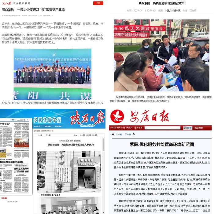 2023年,紫陽(yáng)縣人社局先后被陜西省人民政府評(píng)為全省創(chuàng)業(yè)就業(yè)先進(jìn)集體;被安康市委、市政府評(píng)為全市鞏固擴(kuò)展脫貧攻堅(jiān)成果同鄉(xiāng)村振興有效銜接工作先進(jìn)集體;紫陽(yáng)修腳師勞務(wù)品牌獲評(píng)全國(guó)30個(gè)脫貧地區(qū)特色勞務(wù)品牌;“紫陽(yáng)縣撬動(dòng)勞務(wù)品牌鏈?zhǔn)叫?yīng)”入選人社部鄉(xiāng)村振興辦組織編寫(xiě)的“人社幫扶助力鄉(xiāng)村振興品牌建設(shè)行動(dòng)典型案例匯編”;“紫陽(yáng)縣撬動(dòng)勞務(wù)品牌鏈?zhǔn)叫?yīng)”被陜西省人社廳發(fā)文推廣;《紫陽(yáng)培育修腳勞務(wù)品牌,推動(dòng)穩(wěn)崗就業(yè)增收》經(jīng)驗(yàn)做法在《陜西省鄉(xiāng)村振興簡(jiǎn)報(bào)》刊發(fā);紫陽(yáng)在全國(guó)返鄉(xiāng)入鄉(xiāng)創(chuàng)業(yè)現(xiàn)場(chǎng)會(huì)交流經(jīng)驗(yàn);紫陽(yáng)修腳產(chǎn)業(yè)建設(shè)在全國(guó)鄉(xiāng)村振興培訓(xùn)會(huì)上交流經(jīng)驗(yàn);“紫陽(yáng)修腳師”被認(rèn)定 2023 年陜西省省級(jí)勞務(wù)品牌和省級(jí),紫陽(yáng)縣勞動(dòng)就業(yè)培訓(xùn)中心被認(rèn)定為勞務(wù)品牌創(chuàng)建引領(lǐng)單位。