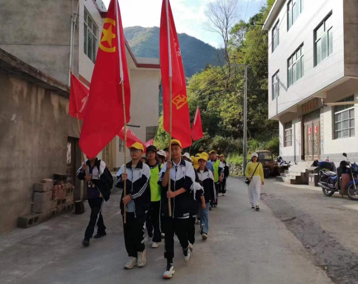 鶯歌燕舞,楊柳依依,沿途中滿山的紫荊樹花競相開放,小溪也發(fā)出潺潺的流水聲,學(xué)生們都徜徉在春天的美景中、感受著春天的勃勃生機。一路笑語、一路歡歌,各班學(xué)生唱著《沒有共產(chǎn)黨就沒有新中國》《歌唱祖國》等經(jīng)典紅歌一路高歌向前,嘹亮的歌聲響遍整個村莊。