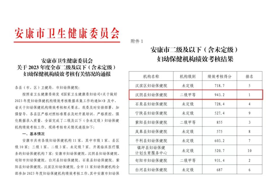 新西部網(wǎng)訊(通訊員 劉先紅 楊 俊)近日,安康市衛(wèi)健委公布了2023年度全市二級(jí)婦幼保健機(jī)構(gòu)績(jī)效考核結(jié)果的通知,漢陰縣婦幼保健院再次在全市10家二級(jí)婦幼保健機(jī)構(gòu)中排名第一,這是繼2022年度考核排名第一后,再次蟬聯(lián)第一。漢陰縣婦幼保健院兩次排名第一,是就診群眾和上級(jí)部門(mén)對(duì)醫(yī)院服務(wù)能力、管理水平、保障婦女兒童健康和生命安全能力的最大認(rèn)可、是婦幼保健機(jī)構(gòu)高質(zhì)量發(fā)展的權(quán)威評(píng)價(jià)。