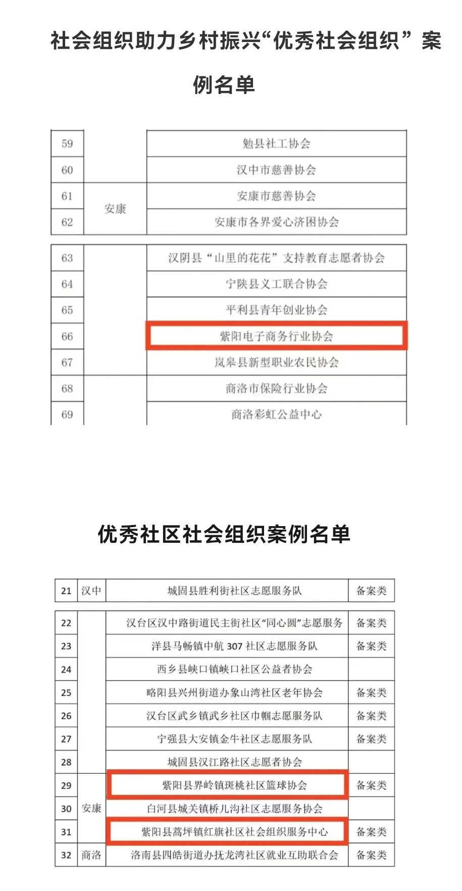 新西部網(wǎng)訊(通訊員李剛)日前,在陜西省民政廳組織開(kāi)展的2023年度全省社會(huì)組織助力鄉(xiāng)村振興優(yōu)秀案例征集活動(dòng)中,紫陽(yáng)縣電子商務(wù)行業(yè)協(xié)會(huì)榮獲全省社會(huì)組織助力鄉(xiāng)村振興“優(yōu)秀社會(huì)組織”;在全省“優(yōu)秀社區(qū)社會(huì)組織”和“優(yōu)秀社區(qū)社會(huì)組織服務(wù)項(xiàng)目”典型案例征集活動(dòng)中,紫陽(yáng)縣界嶺鎮(zhèn)斑桃社區(qū)籃球協(xié)會(huì)、紫陽(yáng)縣蒿坪鎮(zhèn)紅旗社區(qū)社會(huì)組織服務(wù)中心榮獲“優(yōu)秀社區(qū)社會(huì)組織案例”。