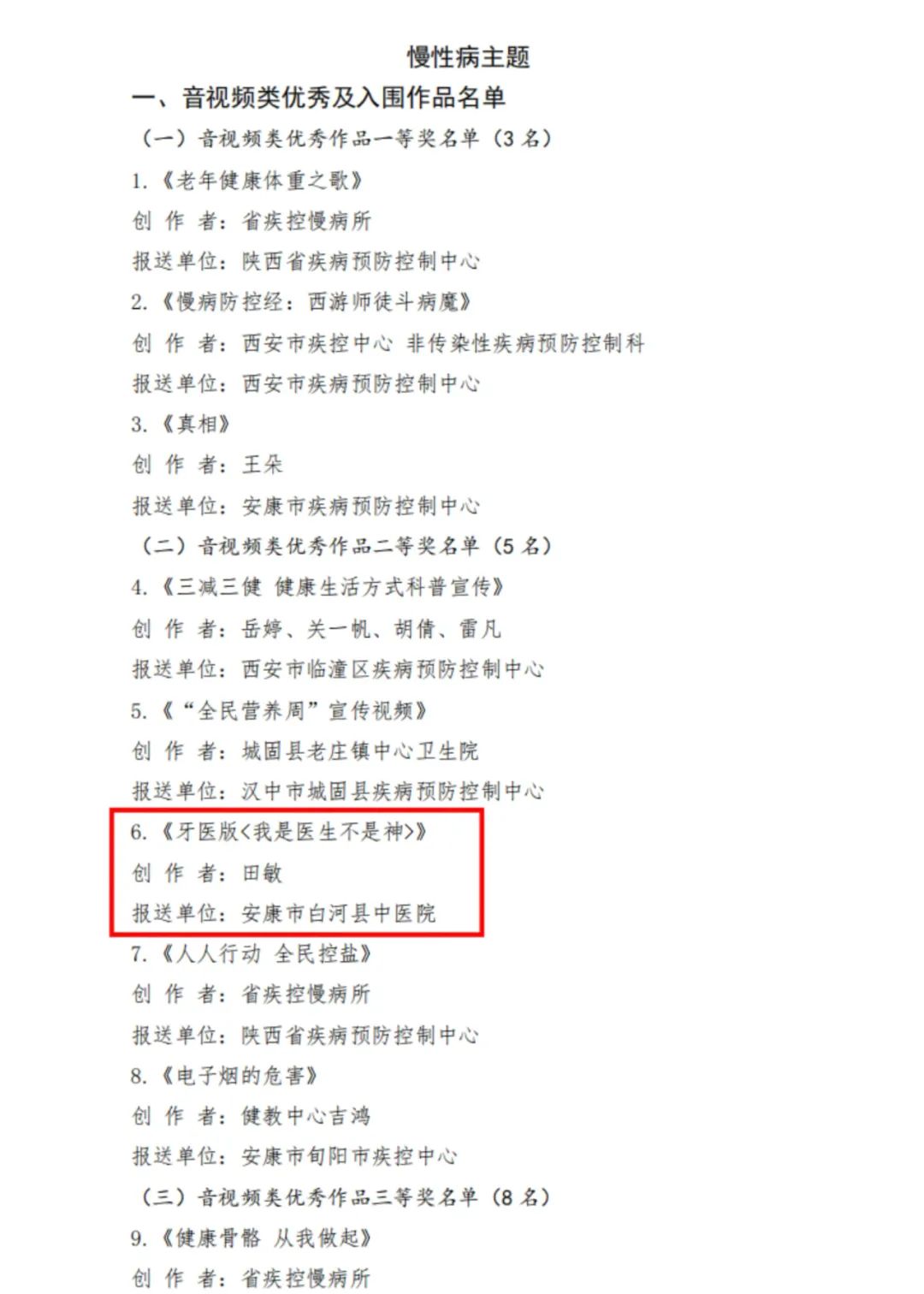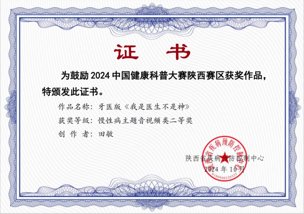 新西部網(wǎng)訊(記者張龍)記者獲悉,10月31日,陜西省疾病預(yù)防控制中心公布了的2024中國健康科普大賽陜西賽區(qū)獲獎名單,白河縣中醫(yī)醫(yī)院制作的短視頻《牙醫(yī)版<我是醫(yī)生不是神>》在眾多參賽作品中脫穎而出,榮獲2024中國健康科普大賽陜西賽區(qū)慢性病主題音視頻類二等獎。