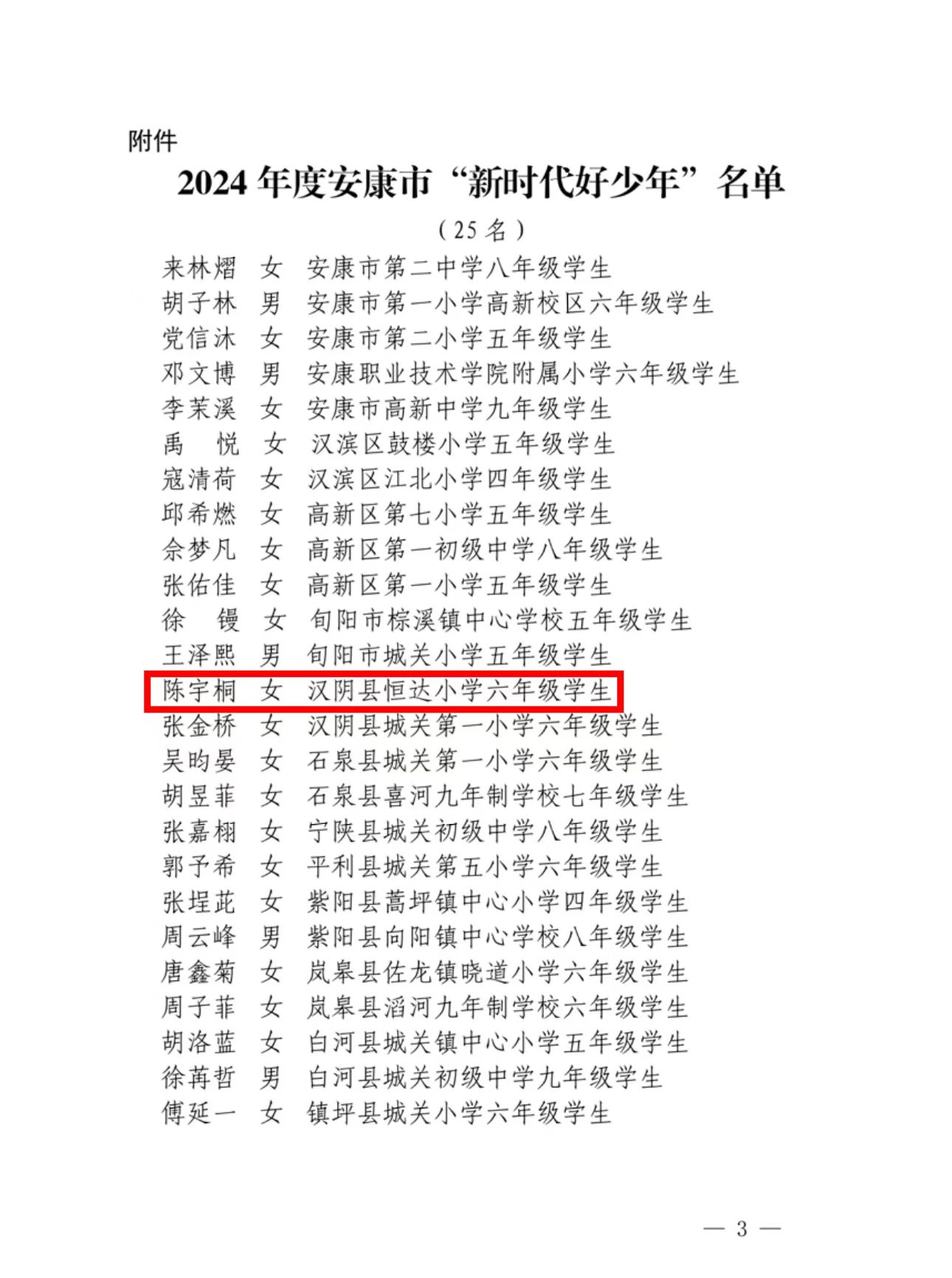 新西部網(wǎng)訊(通訊員陳珠芳)11月22日,中共安康市委精神文明建設(shè)辦公室、安康市教育體育局、共青團(tuán)安康市委、安康市婦女聯(lián)合會(huì)、安康市關(guān)心下一代工作委員會(huì)等5部門聯(lián)合發(fā)布了《關(guān)于2024年度安康市“新時(shí)代好少年”評(píng)選結(jié)果的通報(bào)》,漢陰縣恒達(dá)小學(xué)學(xué)生陳宇桐獲得安康市“新時(shí)代好少年”榮譽(yù)稱號(hào)。
