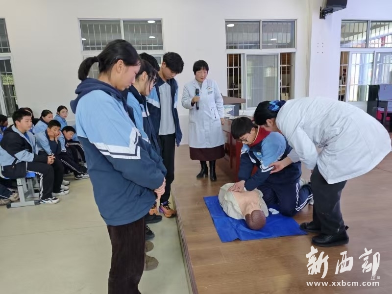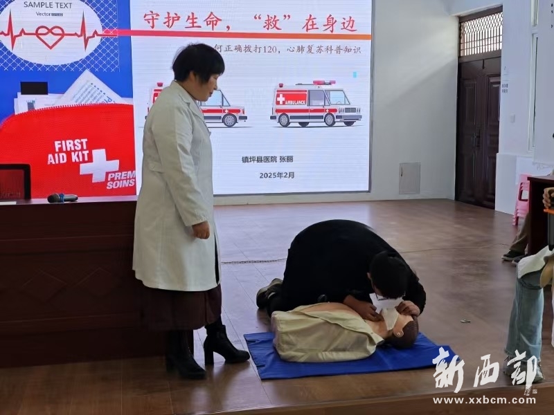 隨后,鎮(zhèn)坪縣醫(yī)院健康教育講師饒?zhí)焯m對心肺復蘇(CPR)步驟展開了詳細講解,每一個操作步驟都搭配生動演示與清晰說明,確保師生能夠精準理解并掌握這一關鍵急救技能。為加深師生對急救知識的理解,講座特意設置互動操作環(huán)節(jié),學生們親自上手實踐,有效強化了對急救技能的理解與記憶。