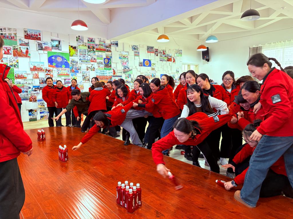 “團(tuán)建游戲篇”中的蛇來運(yùn)轉(zhuǎn)、群龍取水、蒙眼吃水果等游戲讓大家感受到了團(tuán)隊(duì)間的默契與配合的重要性,“移花接木”游戲需要團(tuán)隊(duì)成員在統(tǒng)一口令下步調(diào)一致才能取得勝利,教師們團(tuán)結(jié)協(xié)作、配合默契、順利“接木”,不僅鍛煉了身體也增進(jìn)了彼此間的交流、理解與信任,讓教師忘卻工作生活中的壓力和煩惱,在輕松愉悅的氛圍中放松身心。
