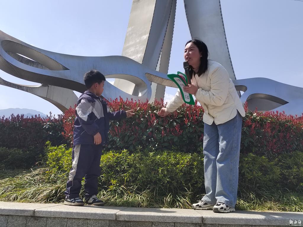 活動當日,孩子們手持精心制作的風車、詩詞卡片、詩畫書簽,滿心歡喜地排著整齊隊伍,向著迎賓公園進發(fā)。一路上,孩子們像歡快的小鳥,觀察路邊的植物,朗誦春天的古詩,感受著春天的氣息,稚嫩的聲音在春日里回蕩。到達目的地,老師們將語文學科知識與春景相結(jié)合,利用識字卡片向孩子們介紹公園內(nèi)常見的植物,并鼓勵孩子們走近植物認真觀察,嘗試用感官去感受、體驗、發(fā)現(xiàn),通過眼看、手摸、鼻聞等方法感知不同植物特點,并認真記錄。隨后,各班學生在老師的帶領(lǐng)下朗誦詩歌、吟唱歌曲、分享觀察日記……在觀察實踐中收獲知識,在游玩中增長才干,這場行走的課堂,讓知識在春風里抽芽,讓能力在行實踐中成長。