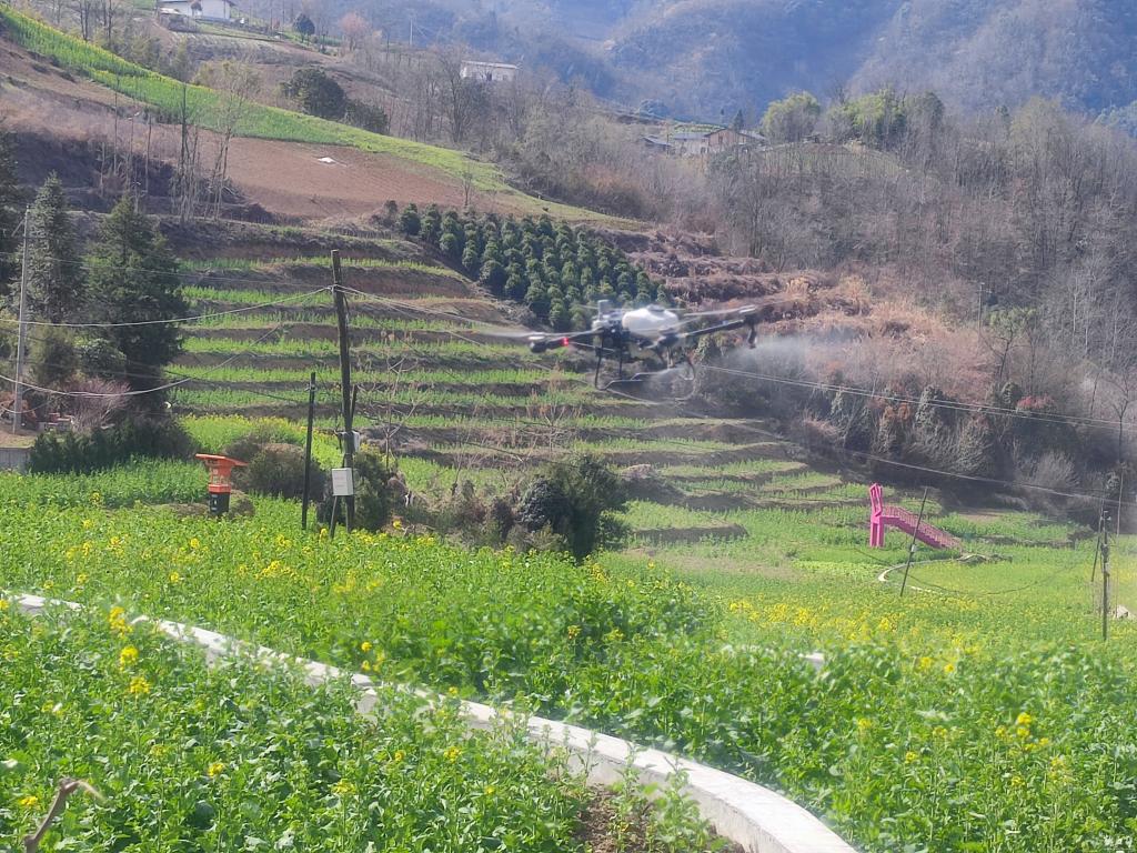 新西部網(wǎng)訊(通訊員 陳劍飛 吳曉)早春之際,嵐皋縣棗樹村的田野間煥發(fā)著勃勃生機。田野間,小春作物綠意蔥蘢,尤其是那連綿成片的油菜田,宛如綠海,在微風中翻涌?!拔宋恕卑殡S著無人機螺旋槳的轟鳴,農(nóng)技人員熟練地操控著無人機翱翔于油菜地上空,無人機沿著預設(shè)的航線,精準無誤地開展飛防作業(yè)。藥液與肥料從空中均勻噴灑,為油菜披上了一層健康的“防護鎧甲”,為油菜的增產(chǎn)增收注入了強勁的新動力。