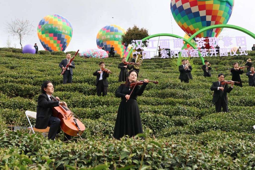 開園儀式有茶山實(shí)景演藝、紫陽民歌聯(lián)唱、祭茶神儀式、華服秀等。上午10時(shí),開園儀式在沉浸式交響樂《春之聲》中浪漫開場,樂團(tuán)成員分布在茶園間,音符隨山風(fēng)流淌,樂聲與茶山風(fēng)光交相輝映,觀眾置身茶園,仿若與自然共譜春之樂章。茶山大秀《生生不息》以天地為幕、茶園為臺,采茶號子響徹山谷,7位紫陽民歌手帶來的聯(lián)唱《山河共鳴》,以原生態(tài)唱腔配以舞蹈演員的靈動演繹,唱響茶鄉(xiāng)人民對自然的敬畏與生活的熱愛。整場演出高潮迭起、亮點(diǎn)紛呈,令嘉賓和游客們流連忘返。