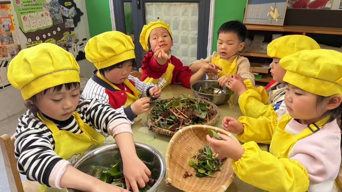 活動中,老師們通過生動形象的圖片和視頻,向幼兒講述春分的來歷、傳統(tǒng)習(xí)俗以及氣候特點(diǎn),教唱有關(guān)春天的童謠,引導(dǎo)孩子們從周圍的環(huán)境中尋找春天的足跡,與春天進(jìn)行親密的互動。別具一格的食育活動更是吸引了孩子們的踴躍參與,他們在老師的悉心指導(dǎo)下,親手采摘蒲公英嫩葉,學(xué)習(xí)清洗、晾曬,并沖泡出清香撲鼻的“春日茶飲”,通過認(rèn)識折耳根,孩子們動手涼拌出了一道道爽口的春日佳肴,在舌尖上品味節(jié)氣文化的韻味。在“彩筆繪春”環(huán)節(jié)中,孩子們將在大自然與生活中捕捉到的春日美景畫在紙上,師幼共創(chuàng)的《春到草池灣》大型墻繪尤為矚目,翩翩起舞的朱鹮、波光粼粼的碧波與田園風(fēng)光交相輝映,傳遞著人與自然和諧共生的美好理念。戶外游戲中,“蝌蚪成長記”角色扮演活動讓孩子們通過身體的蛻變,親身體驗(yàn)生命的奇跡,在跳躍中領(lǐng)悟成長的真諦,孩子們在明媚的陽光下盡情奔跑、嬉戲,享受著春天帶來的無盡樂趣。