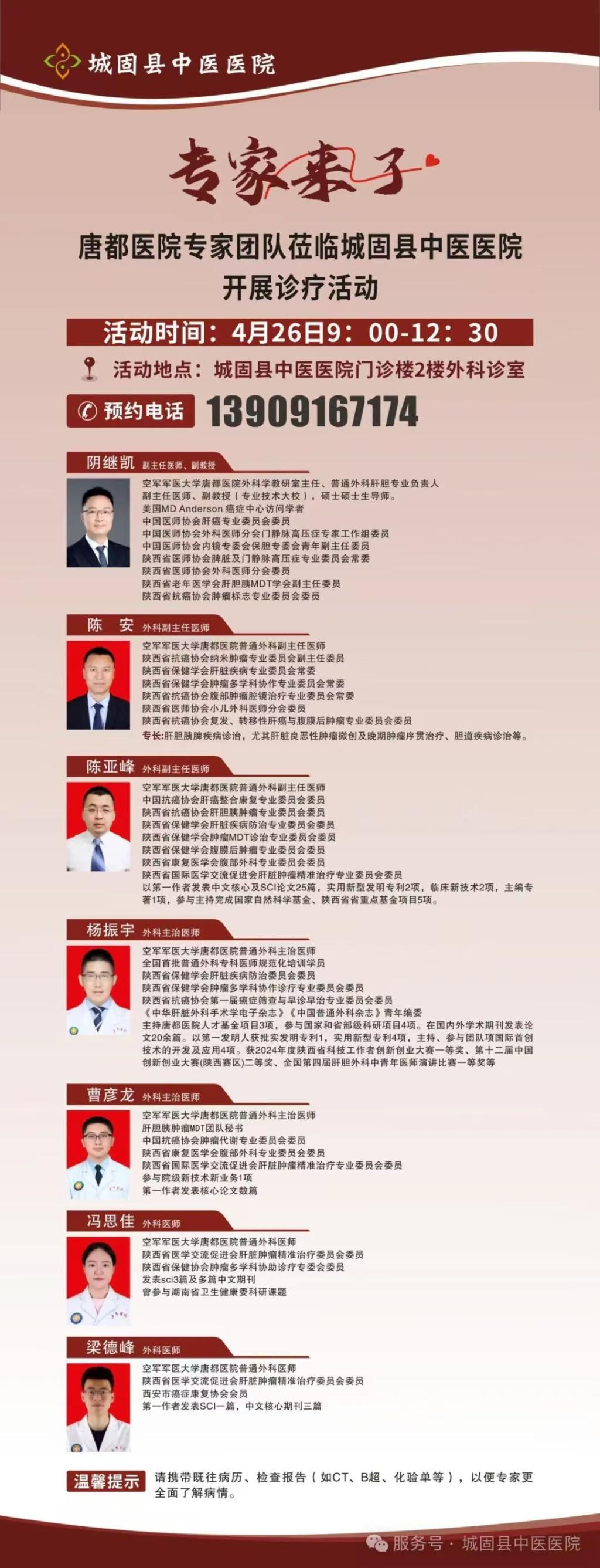 為進(jìn)一步提升醫(yī)療服務(wù)水平,讓城固縣域內(nèi)群眾在家門口就能享受到優(yōu)質(zhì)的醫(yī)療資源,城固縣中醫(yī)醫(yī)院特邀第四空軍軍醫(yī)大學(xué)唐都醫(yī)院外科學(xué)教研室主任、普通外科肝膽專業(yè)負(fù)責(zé)人陰繼凱教授,帶領(lǐng)專家團(tuán)隊(duì)于4月26日蒞臨該院開展義診、教學(xué)查房、手術(shù)等學(xué)術(shù)指導(dǎo)系列活動(dòng),該院歡迎廣大患者朋友前來(lái)咨詢就診。