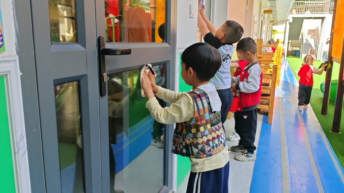 各班教師通過視頻、圖片、故事等形式讓幼兒了解勞動節(jié)的來歷和意義,懂得“勞動最光榮”的道理,并根據(jù)幼兒的年齡和認知特點開展了不同形式的實踐活動。大班的小朋友們變身“自理小達人”,參與了一場別開生面的自理能力比賽。整理被褥、夾花生、收拾書包,孩子們動作嫻熟,爭分奪秒地完成各項任務(wù)。中班的小朋友們則拿起小抹布、小水桶,開展“洗洗我的幼兒園”活動。他們分工合作,擦拭玩具、清掃座椅……用稚嫩的雙手為幼兒園環(huán)境貢獻自己的力量。小班的萌娃們雖然年紀(jì)小,卻用溫暖的行動傳遞著對勞動者的敬意。他們手捧親手制作的手工作品,來到護學(xué)崗警察叔叔身邊,甜甜地說:“叔叔辛苦啦!”這小小的舉動,在孩子們心中播下了尊重勞動者的種子。