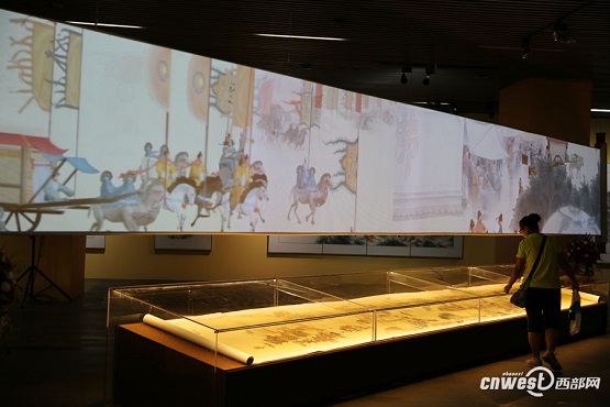 展出的作品均尺幅超大,氣勢(shì)恢宏,如長達(dá)16米的《大唐絲路盛景圖》,是我國以“絲綢之路”為主題的最長的工筆畫卷。以描繪“絲綢之路”為作品內(nèi)容的主題繪畫展,在我國尚屬首次。