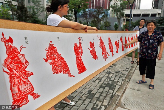 19日,在李容斌的家里,她拿出了自己精心剪成的作品。這是一個裝裱好的長幅畫卷,李容斌緩緩展開畫卷,林沖、武松、宋江等人物一個個躍然紙上,栩栩如生。