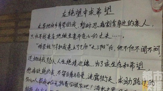 求助信,是她用黑色記號筆寫的,100來個字,字跡工整,如泣如訴,看著感人。她說,她來西安尋找因做生意而變了心的丈夫,說她患上了乙肝大三陽,陷入人生絕境邊緣,為了生存和希望,不顧自尊和自愛,流露街頭,希望好心人幫她湊夠460元的路費回娘家。