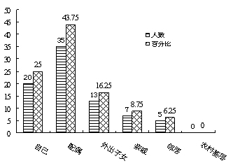 在生活照料方面,子女是留守老人獲取生活照料的最主要提供者,子女的外出使家庭對于老人的照料功能明顯弱化。據(jù)調(diào)查,鄉(xiāng)中村的老人大多數(shù)在日常生活方面可以自理,但是他們最擔(dān)心生病,一方面害怕無法支付醫(yī)藥費,另一方面又擔(dān)心無人照料。圖1表明老人的日常生活以及疾病照料大多靠自己和配偶,外出子女的照料比例很低,沒有來自政府和社會的照料,說明政府和社會在對老人的日常和疾病照料方面是缺失的,老人們一旦生病就感覺和無助,生理心理都承受著沉重的負(fù)擔(dān),這大大降低了他們的幸福感。