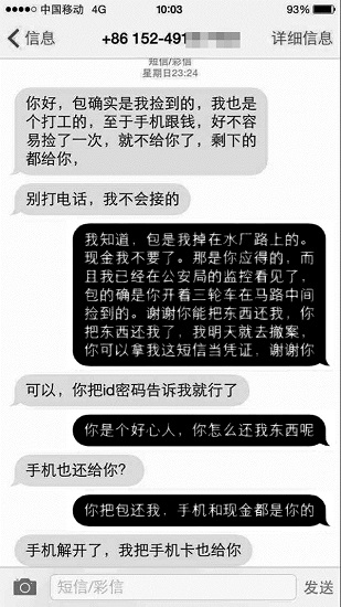 8月16日,從山西運城來西安旅游的姚女士和朋友一起去了西安秦嶺野生動物園,兩人乘坐游9路公交車返程。下午4時多,公交車到達國展中心附近時,姚女士一個疏忽,背包從公交車的窗戶掉了出去,此時公交車還未到站,姚女士急得大喊,司機停車后她沖了下去,往回跑了幾十米后,有人告訴她,一個騎電動三輪車的摩的司機撿走了包。姚女士追了好久,依然沒找到,她說包里裝著4500元、一部蘋果6Plus手機,還有身份證、銀行卡和鑰匙等。姚女士撥打了自己的手機號碼,開始有人接,但最終關(guān)機。姚女士丟失的手機上“查找我的Iphone”功能是打開的,她就向丟失的手機發(fā)了一個信息,希望對方看到后能聯(lián)系她歸還手機。后來對方真的給她回短信了,姚女士提供的截圖顯示,16日晚上11點多,撿包人發(fā)短信說“你好,包確實是我撿到的。我也是個打工的,至于手機跟錢,好不容易撿了一次,就不給你了,剩下的都給你?!币ε口s緊給發(fā)短信的號碼撥打電話,對方不接,短信中說“別打電話,我不會接的?!?/p>